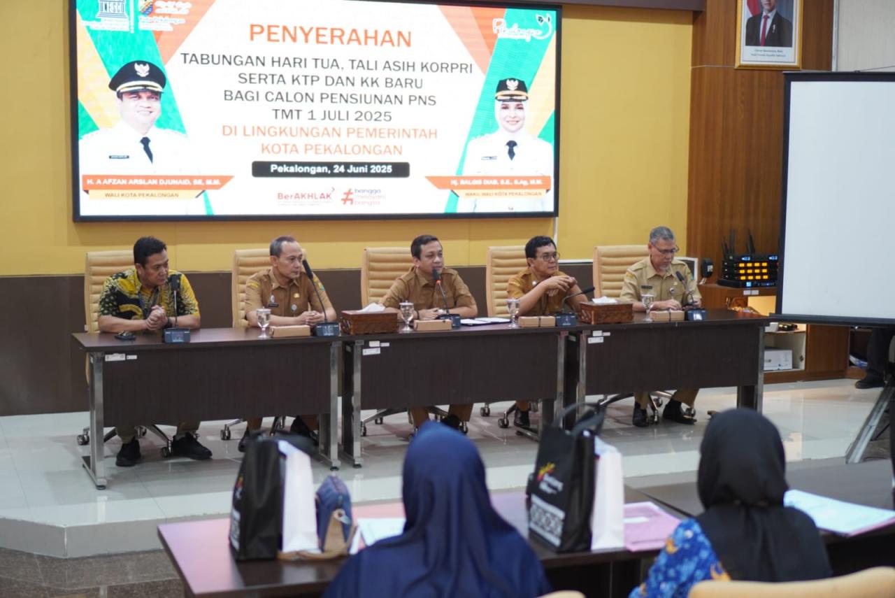 Radarbahurekso.id, Kota Pekalongan – Pemerintah Kota Pekalongan menyerahkan Tunjangan Hari Tua (THT), tali asih Korpri, serta dokumen kependudukan berupa KTP dan KK baru kepada 10 calon pensiunan Aparatur Sipil Negara (ASN) yang akan memasuki masa purna tugas per 1 Juli 2025. Penyerahan dilakukan secara simbolis oleh Wali Kota Pekalongan, HA Afzan Arslan Djunaid didampingi Sekretaris Daerah Kota Pekalongan, Nur Priyantomo, Kepala BKPSDM Kota Pekalongan, Rusmani Budiharjo, serta lainnya di ruang Buketan, Kantor Sekretariat Daerah setempat, Selasa (24/6/2025).
